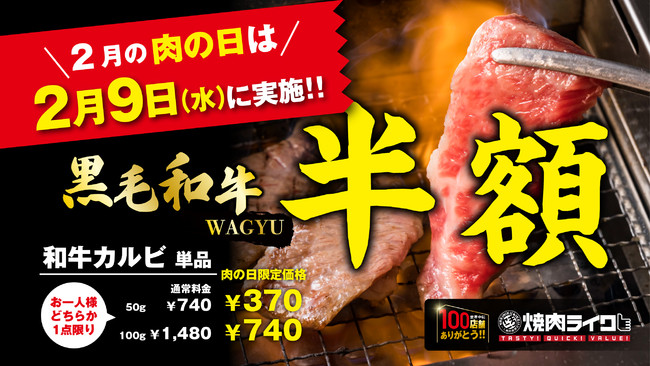 株式会社焼肉ライク(所在地:東京都渋谷区、代表者 有村 壮央)が運営する焼肉のファストフードをコンセプトにした「焼肉ライク」は2月9日(水)肉の日にちなみ、「黒毛和牛カルビ」単品50g を370円(通常価格 740円)、単品100g を740円(通常価格 1,480円) で、70店舗にて販売します。