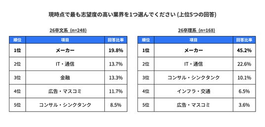 - 文系・理系どちらも志望業界の1位は「メーカー」、志望職種は文系が「企画・マーケティング」、理系が「研究開発」