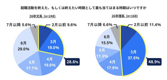 26卒の就職活動終了希望時期を文系と理系で比較すると、本選考エントリー開始時期である「3月」以前に就職活動を終了したい理系の学生は、文系よりも約1.7倍多いことがわかりました。理系は学業・研究との兼ね合いから就活が前倒しになる傾向があり、研究の合間に早めに内定を獲得したいという意識が現れていると推測されます。