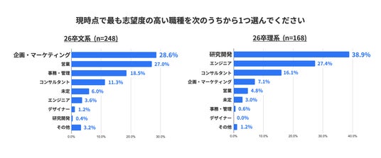 また、文理別に志望度の高い職種を尋ねたところ、文系は「企画・マーケティング」(28.6%)、「営業」(27.0%)、事務・管理(18.5%)に、文系は「研究開発」(38.9%)、エンジニア(27.4%)、コンサルタント(16.1%)の順となりました。