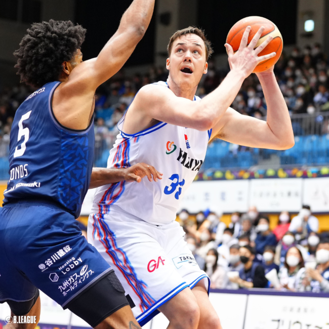 試合開始早々、#43永吉がディフェンスで長崎のオフェンスを封じると、#11白戸選手の連続得点で勢いをつける。 チームでオフェンスリバウンドをもぎ取り#88重冨のコーナー3、#42コッツァー選手のカウントプレーで福岡のオフェンスのリズムを作。再び白戸のアタックや#13中田のジャンパーを成功させ15-21と長崎からリードを奪う。 2Qに入り長崎に連続得点を許し6点ビハインドとなるもタイムアウトから修正を図ると#33ジマルマンも前半だけでブロックショット4本を記録し攻守に渡って活躍をみせる。