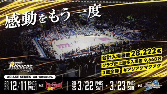 このたび、サンロッカーズ渋谷は2024年12月11日(水)三遠ネオフェニックス戦、2025年3月22日(土)・3月23日(日)島根スサノオマジック戦の3試合を「ARIAKE SERIES」と題し、有明コロシアムにてホームゲームを開催いたします。
