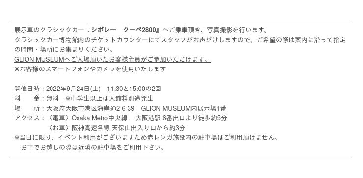 更に2022年9月24日(土)には、この日限定で展示車両であるクラシックカーにご乗車頂き、撮影出来る特別イベントも開催。もちろんお子様でなくてもご参加いただけます!!
