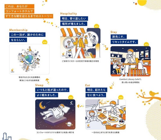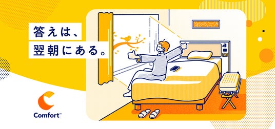 また、これを象徴するキービジュアルは、イラスト展開によってホテルとしての親しみやすさを大切に、コンフォートホテルでお客様に迎えていただける明るくさわやかな心地よい朝を表現しています。 ベースカラーは、太陽の輝きやあたたかさ、親しみやすさを伝えるイエローを採用。このイエローは、世界のコンフォートブランド共通のシンボルであるロゴにおいても「心地よい輝き」を想起させるカラーとして重要な意味をもっており、リフレッシュして新しい1日を迎えることができるような体験を象徴しています。