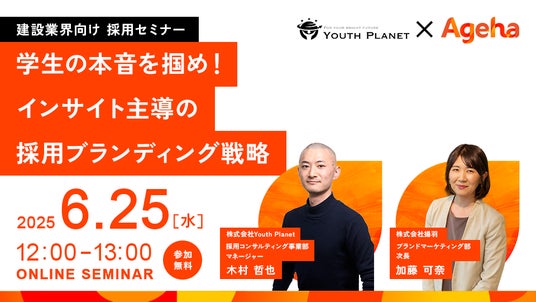 コーポレートブランディング支援を行う株式会社揚羽(東京都中央区 代表取締役社長:湊 剛宏 証券コード:9330)は、「《建設業界向け》学生の本音を掴め!インサイト主導の採用ブランディング戦略」と題したオンラインセミナーを、2025年6月25日(水)に開催します。セミナー詳細はコチラ。