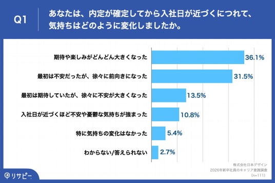 「Q1. あなたは、内定が確定してから入社日が近づくにつれて、気持ちはどのように変化しましたか。」(n=111)と質問したところ、「期待や楽しみがどんどん大きくなった」が36.1%、「最初は不安だったが、徐々に前向きになった」が31.5%という回答となりました。