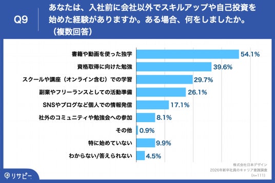 「Q9. あなたは、入社前に会社以外でスキルアップや自己投資を始めた経験がありますか。ある場合、何をしましたか。(複数回答)」(n=111)と質問したところ、「書籍や動画を使った独学」が54.1%、「資格取得に向けた勉強」が39.6%、「スクールや講座(オンライン含む)での学習」が29.7%という回答となりました。
