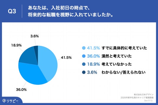 「Q3. あなたは、入社初日の時点で、将来的な転職を視野に入れていましたか。」(n=111)と質問したところ、「すでに具体的に考えていた」が41.5%、「漠然と考えていた」が36.0%という回答となりました。