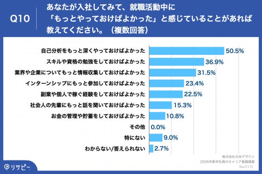 「Q10. あなたが入社してみて、就職活動中に「もっとやっておけばよかった」と感じていることがあれば教えてください。(複数回答)」(n=111)と質問したところ、「自己分析をもっと深くやっておけばよかった」が50.5%、「スキルや資格の勉強をしておけばよかった」が36.9%、「業界や企業についてもっと情報収集しておけばよかった」が31.5%という回答となりました。