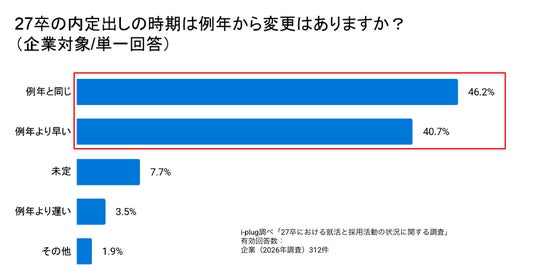 企業に対し、27卒の内定出し時期について、例年との比較を聞きました。結果は「例年より早い」と回答した企業は40.7%でした。 一方で、「例年と同じ」と回答した企業が、最多の46.2%。採用市場全体が一律に早期化しているわけではなく、スケジュールを早める企業群と、従来通りのスケジュールで動く企業群に分かれていると推察できます。