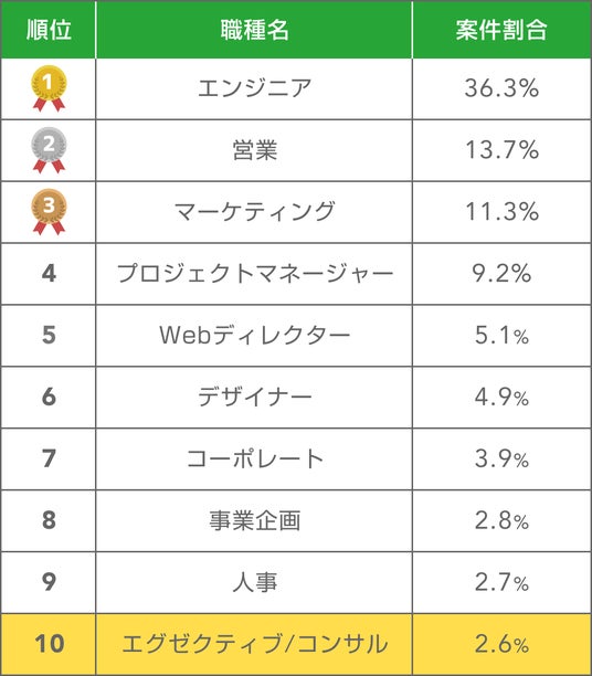 エグゼクティブ/コンサル 10位 案件比率2.6%