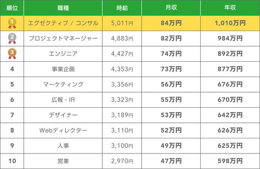 平均年収1,010万円(職種別年収ランキングトップ10中、1位)
