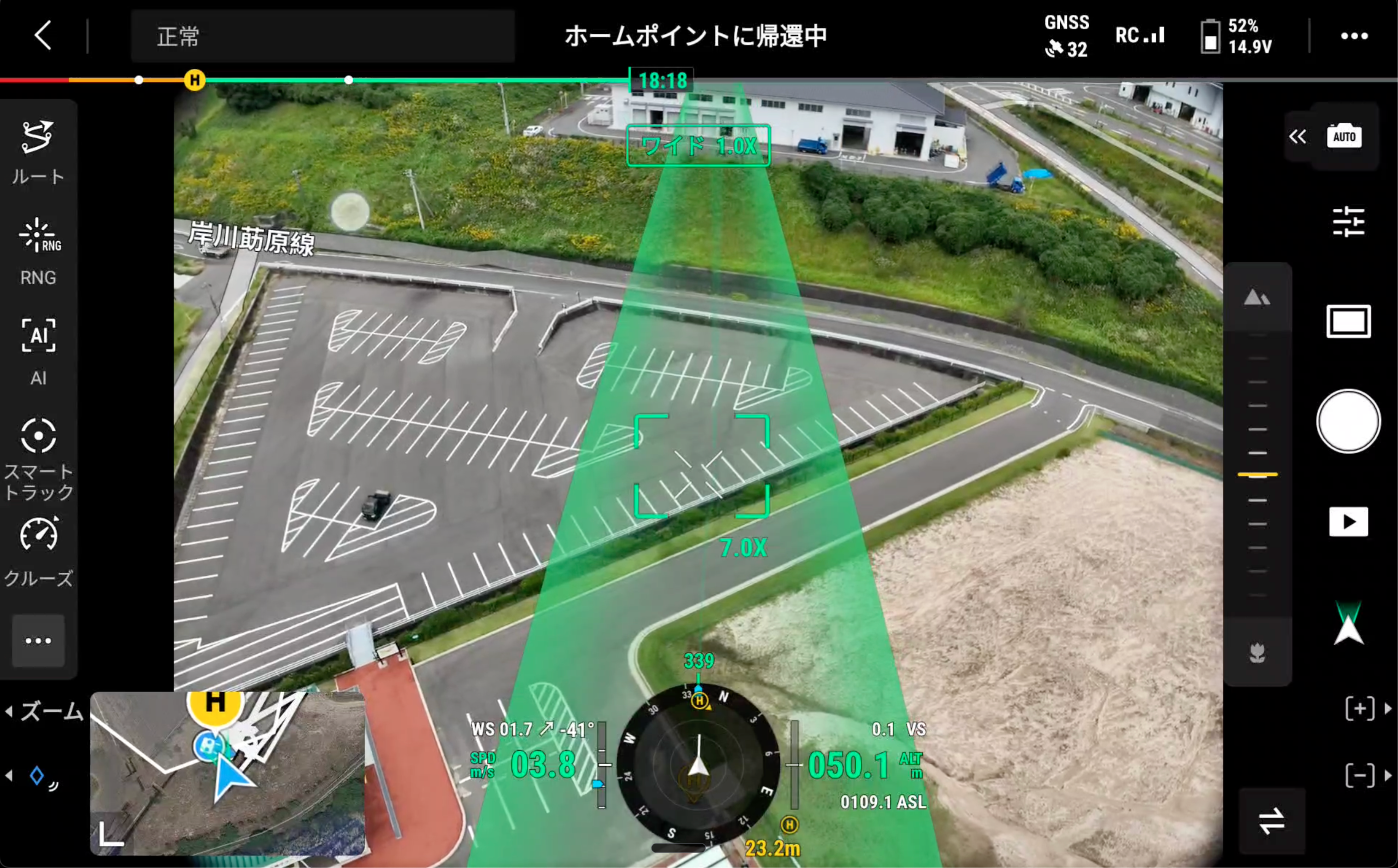 帰り道の「ドローン航路」がリアルタイムで画面に表記される様子