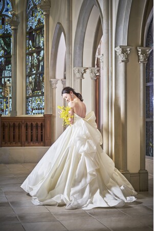 大聖堂に映える圧倒的なバッグスタイル。シルクガザ―ルという独特のハリ感のある生地がふっくらとしたスカートのシルエットを作り上げています。蝶々が羽を広げている様にも見えるバックモチーフが、シンプルなドレスに華やかさを加え、可憐な花嫁像を作り上げます。