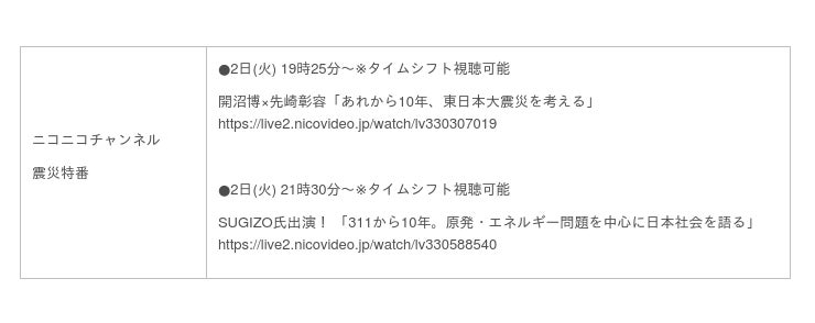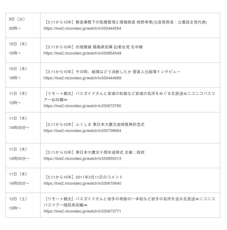 ニコニコ生放送にて、3月9日(火) から3月13日(土)にかけて、東日本大震災特集を放送します。