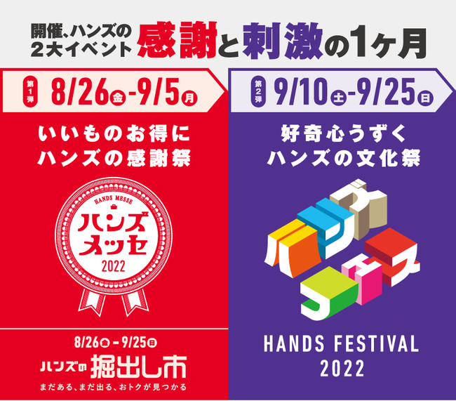 株式会社東急ハンズ(本社:東京都新宿区)は、いいものお得にハンズの感謝祭「ハンズメッセ」を8月26日(金)から9月5日(月)までの11日間開催いたします。また今年初の開催、好奇心うずくハンズの文化祭「ハンズフェス」を9月10日(土)から9月25日(日)までの16日間実施いたします。