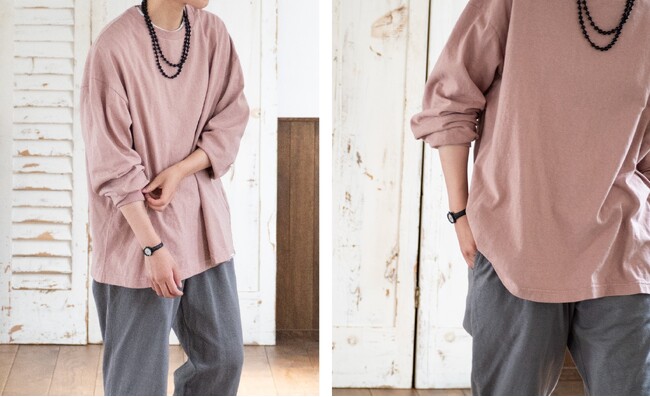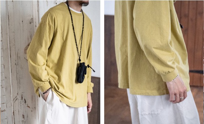 天然素材の裁断くずを活用した再生ファブリックの素朴な風合いの長袖ビッグTシャツから「PINK」と「MUSTARD」の新色がラインナップ。