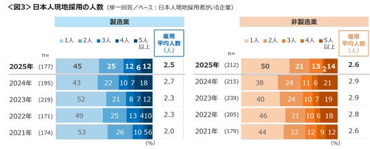 雇用人数に目を向けると、製造業および非製造業で前年より平均人数が減少。特に非製造業は「1人」の割合が50%(前年比12pt上昇)、「5人以上」は14%(前年比7pt低下)と変動した。<図3>