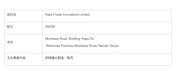 双日株式会社(以下「双日」)は、ケニアの消費財製造大手Kapa Oil Refineries(カパオイルリファイナリーズ) Limited(以下「KOR」)と共同で、ケニアを含む東アフリカ地域をターゲットにした即席麺の製造販売事業(以下「本事業」)を展開する合弁会社Kapa Foods Innovations(カパフーズイノベーションズ) Limitedを設立し、最初の商品として今月、東アフリカ地域で最も人気が高いチキン味の即席麺をケニアで発売します。