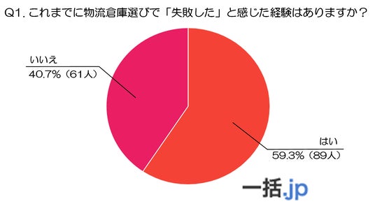 - 最も多かったのは「はい」と回答した人で、全体の59.3%(89人)にのぼっています。物流倉庫の選定において半数以上の人が何らかの“失敗体験”を持っていることがわかります。一方、「いいえ」と答えた人は40.7%(61人)でした。