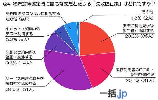 - 最も多かったのは「サービス内容や料金を複数社で比較する」で、34.0%(51人)が有効な失敗防止策として挙げています。倉庫選びの際には、ひとつの業者だけでなく複数の候補を比較検討することが、失敗リスクを下げるうえで最も重要視されている傾向がうかがえます。