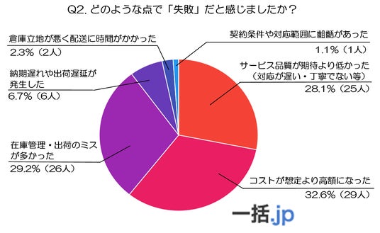 - 次いで多かったのは「在庫管理・出荷のミスが多かった」(29.2%・26人)や「サービス品質が期待より低かった(対応が遅い・丁寧でない等)」(28.1%・25人)で、現場オペレーションやカスタマーサービスに対する不満も目立っています。コスト以外にも、実務面や対応力に対して高い期待とシビアな評価がなされていることが特徴です。