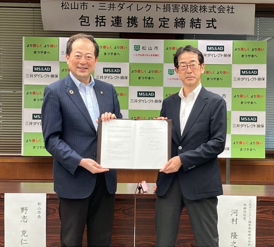 MS&ADインシュアランス グループの三井ダイレクト損害保険株式会社(取締役社長:河村 隆之、URL:https://www.mitsui-direct.co.jp/、以下「三井ダイレクト損保」)は、愛媛県松山市(市長:野志 克仁)と2025年7月14日(月)に包括連携協定を締結しました。三井ダイレクト損保が自治体と、松山市がネット損保と包括連携協定を締結するのは、いずれも初めてとなります。