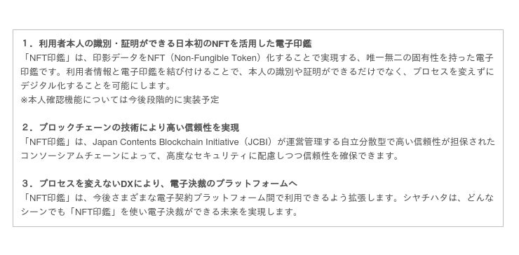 シヤチハタ株式会社※(代表取締役社長 舟橋 正剛 本社:愛知県名古屋市)は、株式会社ケンタウロスワークス(代表取締役:三枝 充 本社:東京都千代田区)、早稲田リーガルコモンズ法律事務所(代表弁護士:河崎 健一郎 本社:東京都千代田区)とブロックチェーンを利用した電子印鑑システム「NFT印鑑」を共同開発することで合意しました。