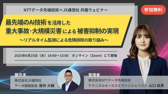 NTTデータ先端技術とJX通信社は、「先端技術のAI技術を活用し、重大事故・大規模災害による被害抑制の実現」についての共催ウェビナーを開催します。