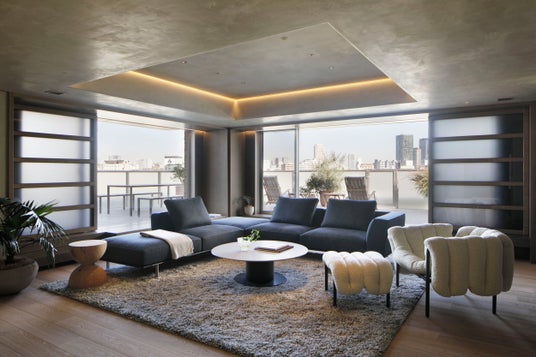 最上階に位置し、大きなルーフバルコニーを備える約210平米の住戸。設計デザインを二俣公一氏率いるケース・リアルが、インテリアコーディネートおよび家具の製作をE&Yが担当しています。