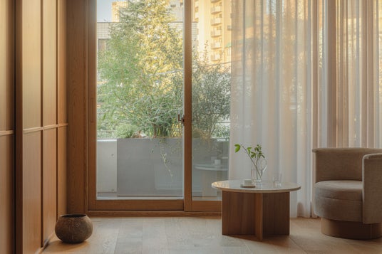 自然に由来する「土」を連想させるカラーを使用し、内装材には左官仕上げや天然木を用いることで、室内においても自然に包まれているような空間を構築しました。LDKの大きな開口部には、スモークガラスを用いた内窓サッシを設置しています。障子のような役割やデザインを目指してオリジナルで製作したもので、開閉することで外部との繋がりや光の加減をコントロールできます。「住まい手自身がアナログで快適さをチューニングする」という暮らし方を提案しています。また、内窓サッシは温熱環境の向上に寄与しますが、カーテンが無くても外部からの視界を緩やかに遮る役割も持ちます。外側のサッシと内側のサッシの間には照明を設置しており、行燈のような灯りを室内からも室外からも楽しめる、本住戸の重要なキーパーツとなっています。また各スペースにはE&Yにより、セレクト・オリジナル製作された家具や自然を感じさせるアート作品が散りばめられ、本住戸の空間と親和性を図りながら素材や色のレイヤーを重ねています。都市生活の中で自然を感じ、暮らしを愉しむ豊かさが心地よく調和する空間へと作り上げました。