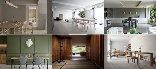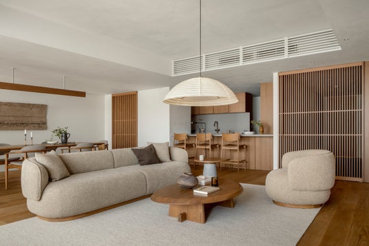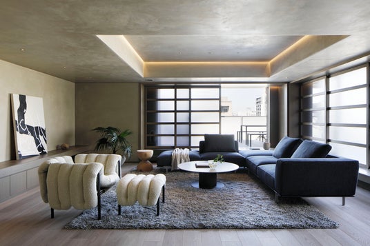 北向き住戸ながら、広い開口部と内装デザインによって明るい室内を実現した約220平米の住戸。設計デザインを芦沢啓治氏が、家具等の製作をカリモク家具が担当しています。