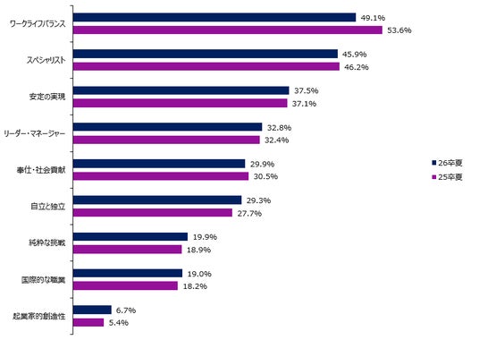 <図2>よりキャリアゴールとして、スペシャリスト、ワークライフバランスを挙げる学生の割合は昨年度に比べ減少はしているが、学生が引き続き重要視している項目です。
