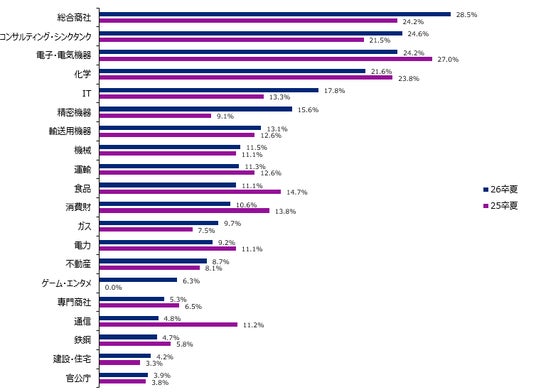人気業界順位が大幅に変動。1位総合商社(昨年2位)、2位コンサルティング・シンクタンク(昨年4位)、3位電気・電子機器(昨年1位)。