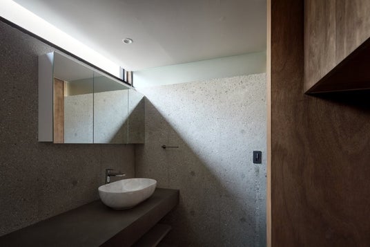 丸みのある石を積み上げたような洗面台。石は川の流れなどで長い時間をかけ、柔らかな丸みを帯び、得も言われぬ美しさを持っている。自然が作り出してくれた、ミニマルな形状を組み合わせ、空間に優しく溶け込むようにデザインした。