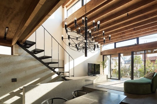 武蔵野台地の舌状の丘に位置する敷地。植栽ポットの隙間を「谷」と見立てたアプローチから高さを抑えた玄関へ入り、階段を上がると緑が広がる開放的な空間。RC腰壁と木造フレームで耐力壁を避け、南北に抜ける眺望を確保し、谷から丘への流れを感じるくらしを実現。