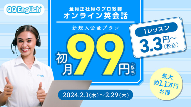 株式会社QQEnglish (本社:東京都渋谷区、代表取締役:藤岡 頼光)は、提供するオンライン英会話サービス「QQEnglish」「QQキッズ」にて、2024年2月1日より「新規入会全プラン 初月99円キャンペーン」を開始したことをお知らせいたします。