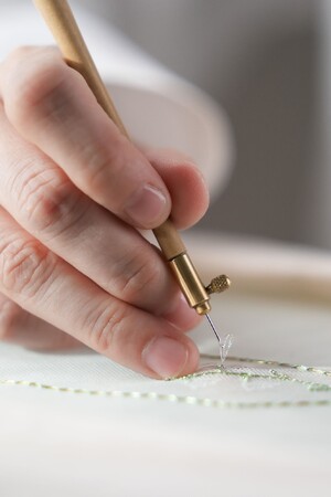 長い歴史を持つ”刺繍”という芸術を受け継ぐ職人たちにより、限りないクリエイティビティが生み出されています。優しいグリーンのチュールを、同系色の糸で縁取ったリボンを作り、そこに刺繍職人が手作業で、葉の一枚一枚に露の真珠のように輝くスズランの小枝を刺繍しています。数時間に及ぶ丁寧な作業を経て、この素晴らしく詩的なオートクチュールリボンが完成します。
