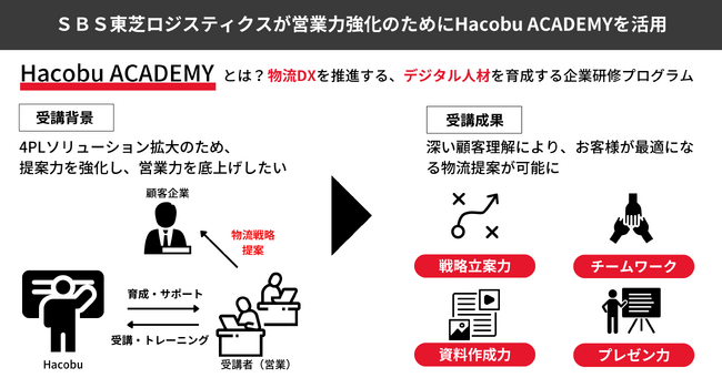 株式会社Hacobu(ハコブ、本社:東京都港区、代表取締役社長CEO 佐々木太郎、以下「Hacobu」)は、SBS東芝ロジスティクス株式会社が、「物流DX」推進に向けた「デジタル人材」を育成する企業研修プログラム「Hacobu ACADEMY」の受講により、今後の事業の柱となる4PLソリューション(※1)の営業体制の礎を築くことに成功した事例記事を公開いたします。