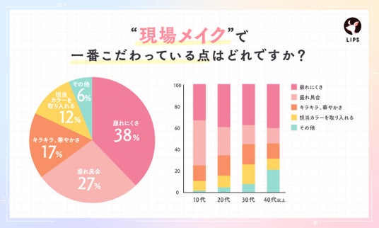 続いて「現場メイク」のこだわりを聞いたところ、「崩れにくさ」(38%)、「盛れ具合」(27%)、「キラキラや華やかさ」(17%)という回答順となりました。