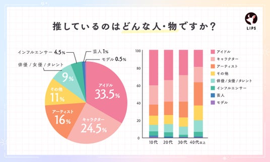 続いて、"推し"がどのようなジャンルの方なのかを聞いてみると、一番多かったのが「アイドル」(33.5%)、その次に「キャラクター」(24.5%)、「アーティスト」(16%)という結果に。