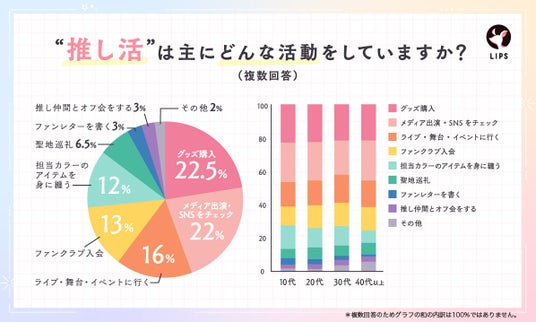 全体で一番多い回答が「グッズ購入」(22.5%)、僅差で「メディア出演・SNSをチェック」(22%)、そして「ライブ・舞台・イベントに行く」(16%)が上位となりました。