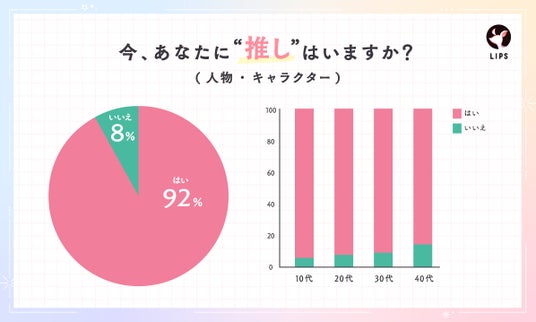 まず、今現在"推しの人"(キャラクター)がいるのをヒヤリングしたところ、全体で90%以上の方に"推し"がいるという実態がわかりました。