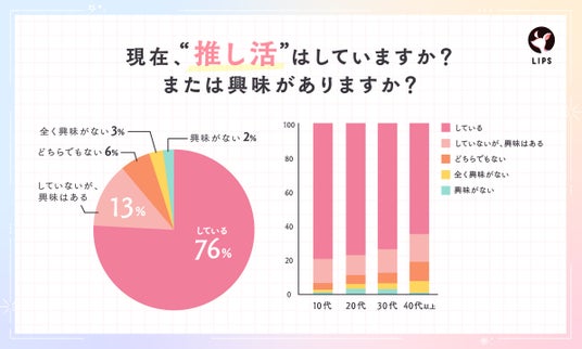 現在「推し活をしている」と答えた方が全体で76%、世代別の回答結果を見ても10~30代では約80%、40代以上では60%以上と非常に多くの方が"推し活"をしていることが判明。