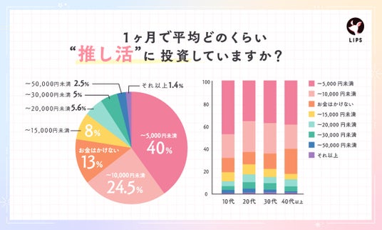続いて、"推し活"で1ヶ月平均どのくらいお金を使っているのか聞いてみたところ、上位の回答は「~5,000円未満」(40%)、「~10,000円未満」(24.5%)、「お金はかけない」(13%)という結果に。
