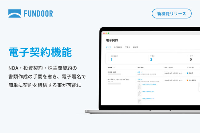 株式会社FUNDINNO(本社:東京都品川区、代表:柴原 祐喜/大浦 学、以下「当社」)が運営する株主管理・経営管理プラットフォーム「FUNDOOR(ファンドア)」は、新たに「電子契約機能」を実装したことをお知らせいたします。