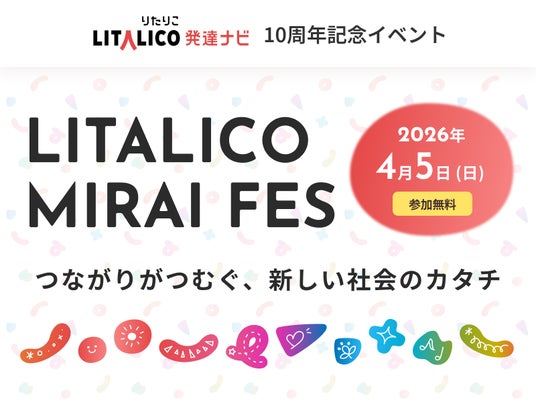 「障害のない社会をつくる」というビジョンの下、障害者向け就労支援事業や子どもの可能性を広げる教育事業等を展開する株式会社LITALICO(本社:東京都目黒区、代表取締役:長谷川敦弥、証券コード:7366)は、2026年4月5日(日)に開催する「LITALICO発達ナビ」サービス開始10周年記念イベント『LITALICO MIRAI FES(リタリコミライフェス)』のプログラムを発表し、本日2026年2月5日(木)より特設サイトにて参加申し込みおよび各プログラムの事前予約受付を開始いたしました。