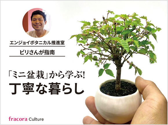 今回の“fracoraカルチャー”では、普段の生活にトキメキをもたらす「ミニ盆栽」をテーマに、「エンジョイボタニカルライフ推進室」室長のビリさん(氏井 暁さん)よりお話しいただきます。