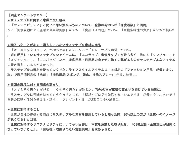 また、今回のアンケート結果を元に、当社とELEMINISTで、消費者が本当に欲しいサステナブルなファッションアイテム作りを進めてまいります。