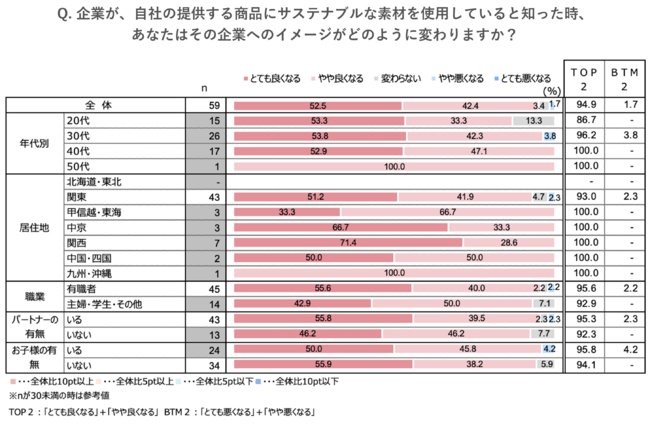 『企業が、自社の提供する商品にサステナブルな素材を使用していると知った時、あなたはその企業へのイメージがどのように変わりますか(※単一回答)』という質問では、全体で「とても良くなる」と答えた方が52%、「やや良くなる」と答えた方が42%と、90%以上の方がサステナブルな素材を使用している企業へのイメージが良くなると回答しました。